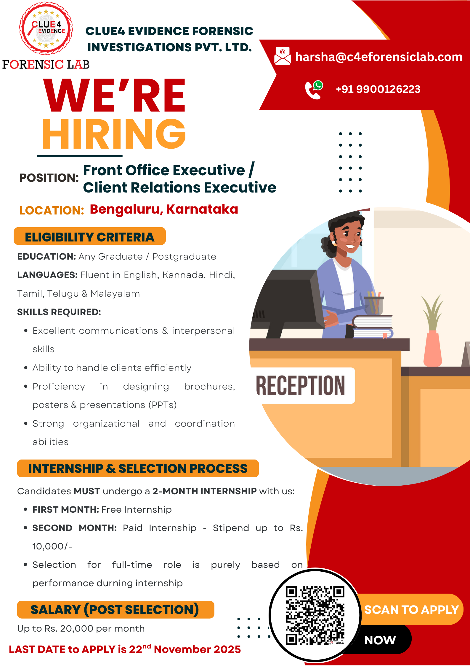 JOB TITLE: Front Office Executive / Client Relations ExecutiveLocation: Clue4 Evidence Forensic Lab, Bangalore.Deadline: 22nd November, 2025