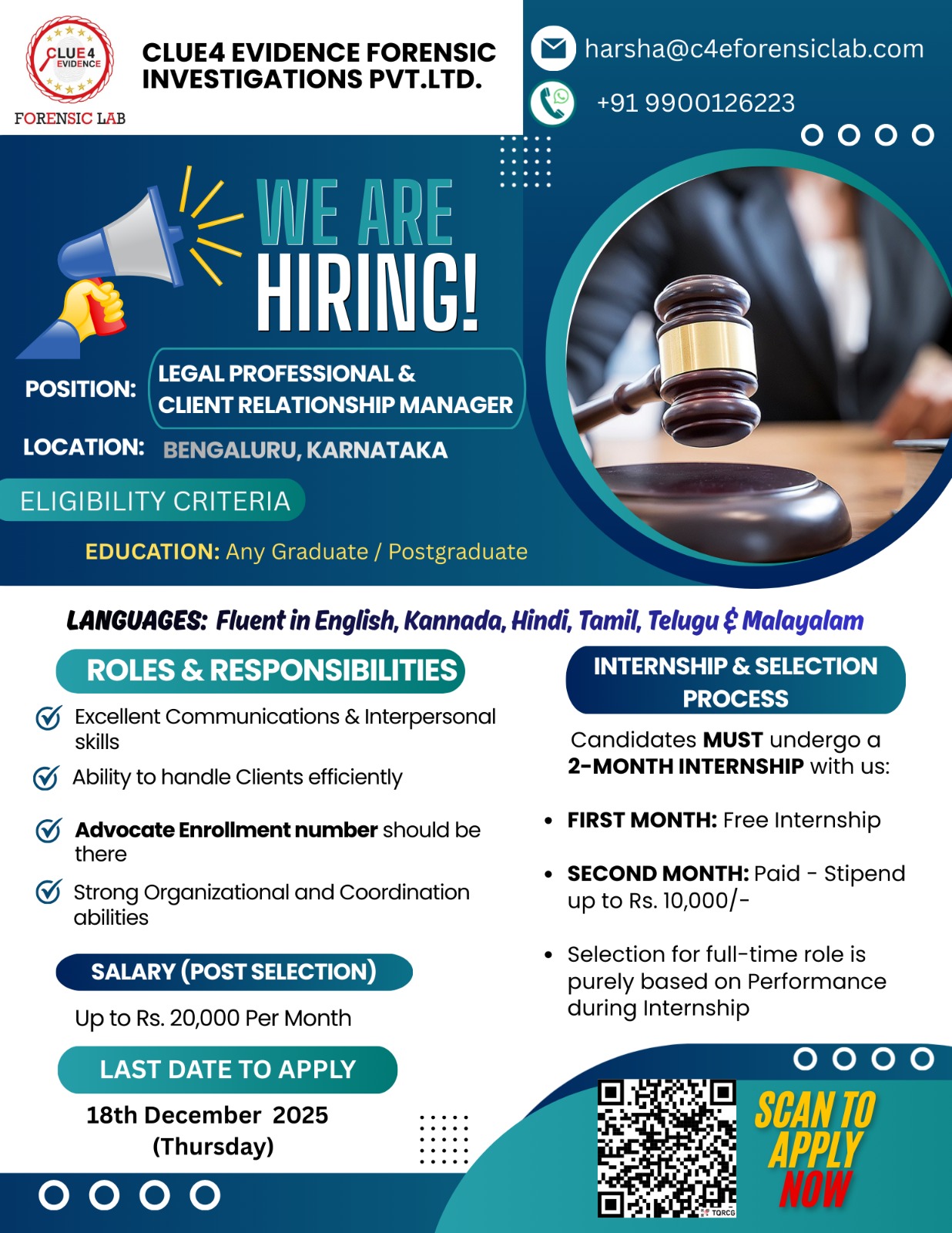 JOB TITLE: Legal Professional & Client Relationship ManagerLocation: Clue4 Evidence Forensic Lab, Bangalore.Deadline: 18th December, 2025