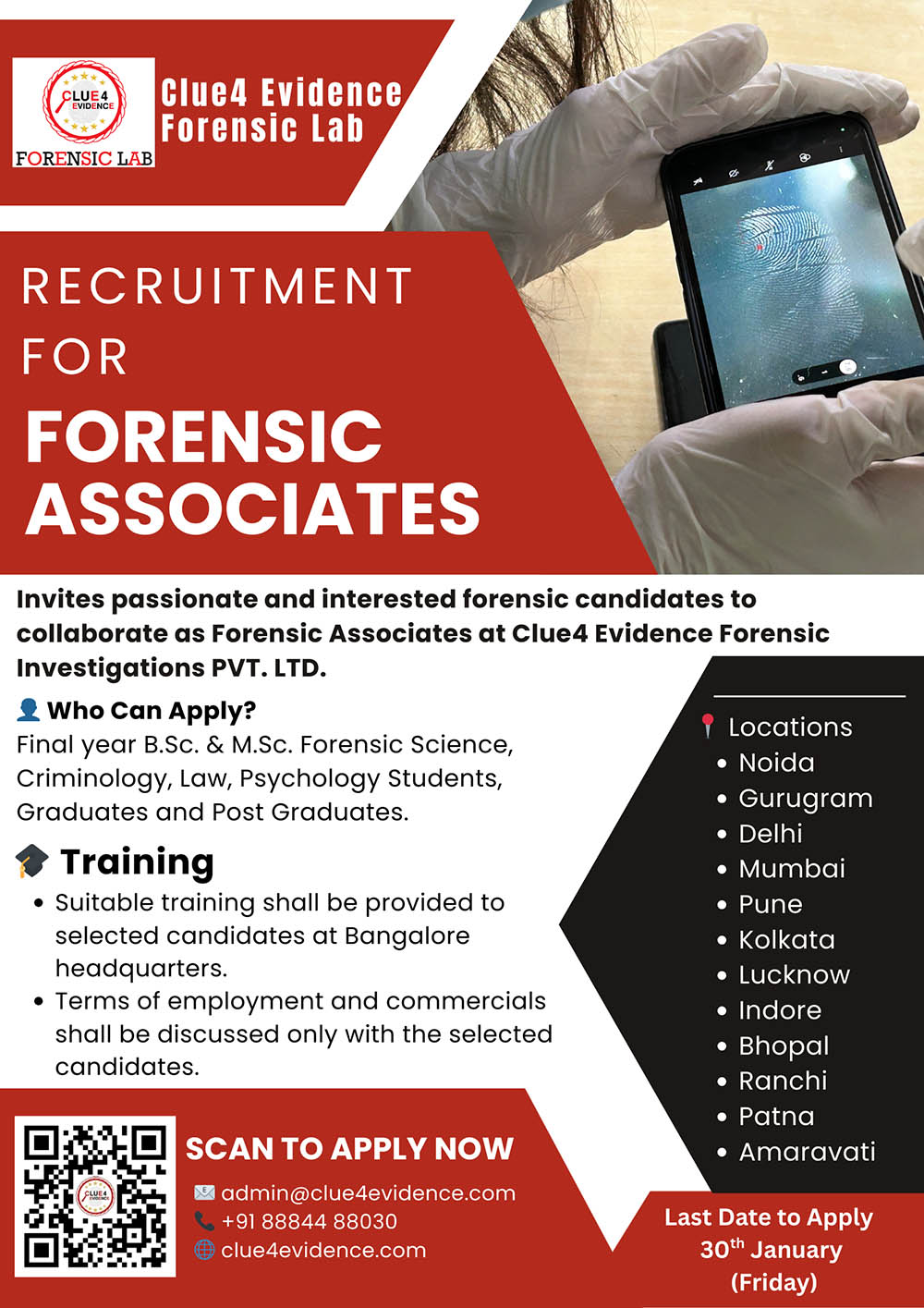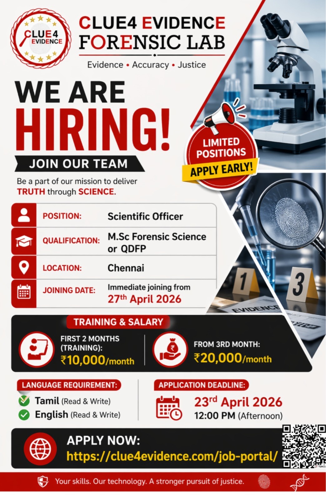 JOB TITLE: Scientific OfficerDepartment: (i) Questioned Document and Fingerprint Division(ii) Digital & Cyber Forensic DivisionLocation: Clue4 Evidence Forensic Lab, Chennai.Deadline: 15th may, 2025