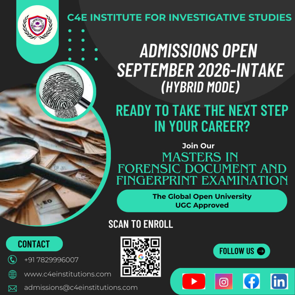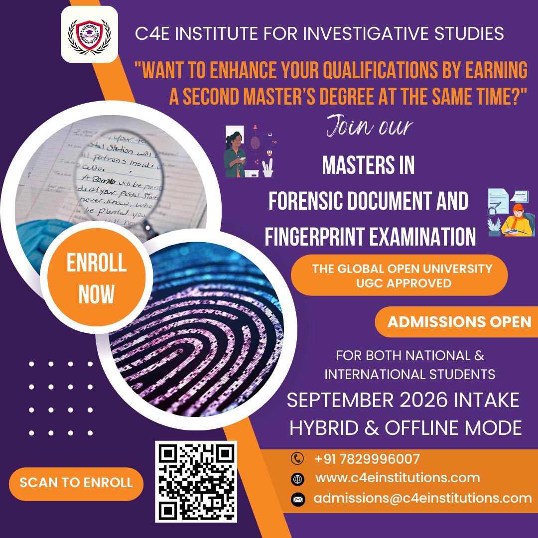 Masters in Forensic Document & Fingerprint Examination is the course offered by C4E Institute for Investigative Studies in collaboration with The Global Open University, Nagaland(UGC recognized). The only Masters level course which entirely focused on FORENSIC DOCUMENT & FINGERPRINTS EXAMINATION and related investigations as a career. It is a detailed course that aims to provide investigative skills with a wide array of diverse topics related to Science, Management, Law, Finance, Psychology, etc. This course specifically focuses on industry fraud and risk mitigation industry which is now emerging as one of the main verticals of any corporates. This course shall meet the requirements under UGC, NITI Aayog, Skill India, which are specifically focused on skill based education by the Government of India.