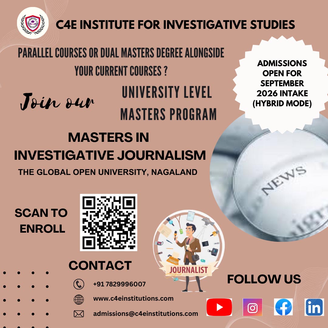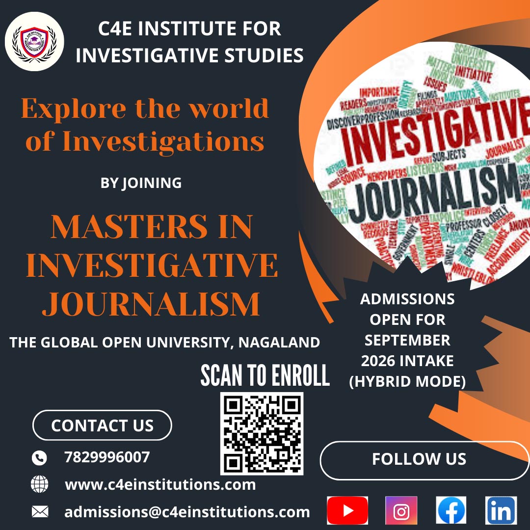 Masters in Investigative Journalism is the course offered by C4E Institute for Investigative studies in collaboration with The Global Open University, Nagaland(UGC recognized). The M.Voc in Investigative Journalism is a comprehensive program designed to equip students with advanced reporting and investigative skills across various domains, including politics, business and finance, cyber and digital media, healthcare, environmental issues, human rights, crime and corruption, and the public sector. With a strong focus on uncovering truth, exposing fraud, and ensuring transparency, this program addresses the complex and evolving challenges faced in investigative reporting. Students will gain in-depth knowledge and practical expertise to research, analyze, and report on critical issues, positioning themselves as skilled professionals in a rapidly evolving media landscape.