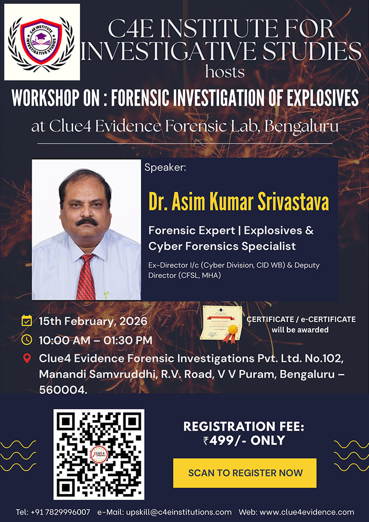 At Clue4Evidence Forensic Lab, we believe in learning by doing. Our specialized workshops provide hands-on training, real-world case studies, and expert insights into the dynamic field of forensic investigation. Designed for students, professionals, and law enforcement personnel, these workshops cover essential forensic techniques and the latest advancements in the field.